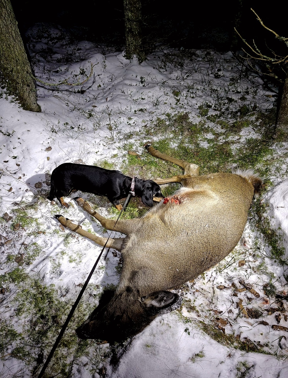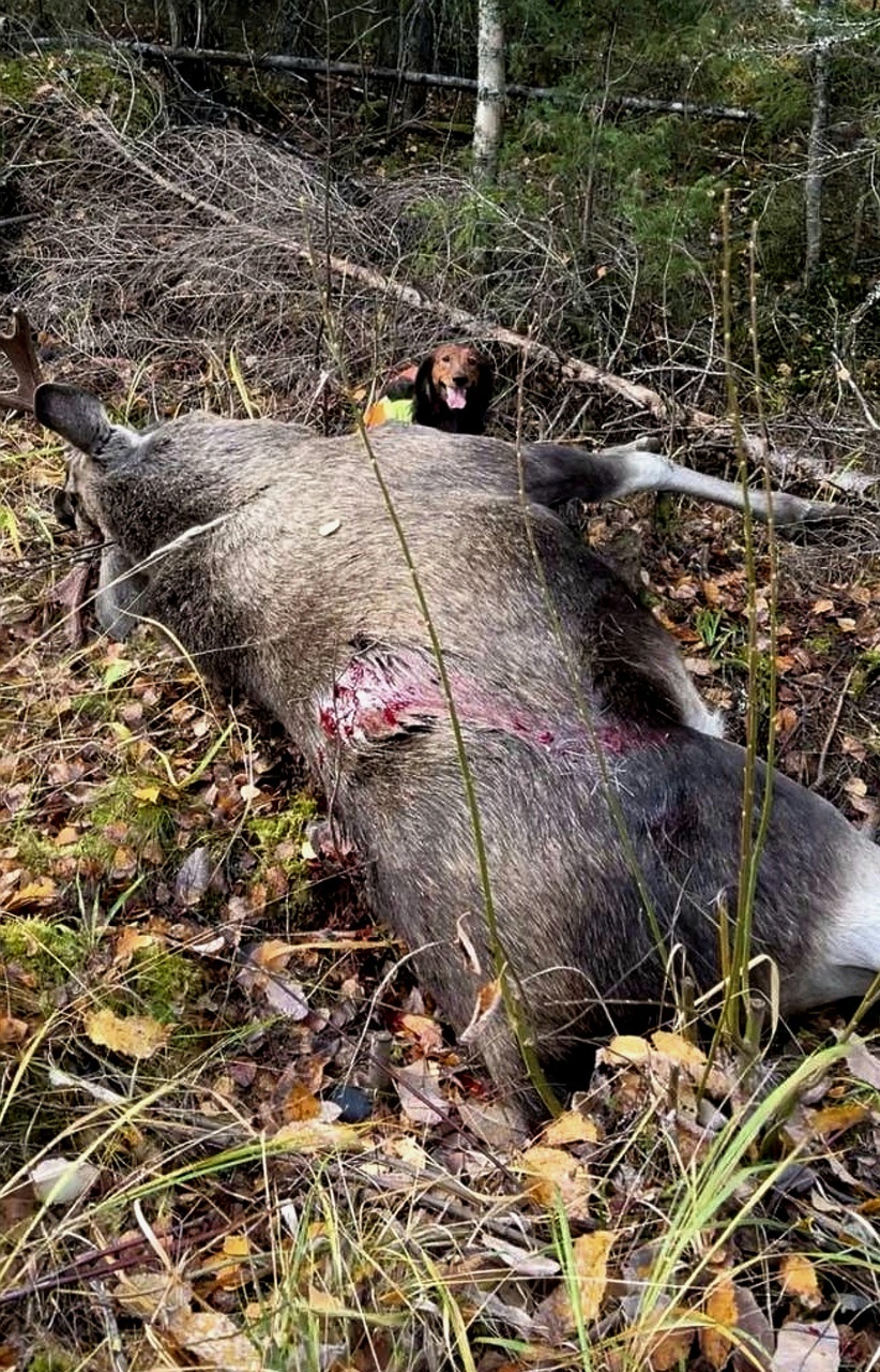 Pitkäkarvaisen mäyräkoiran Wood-Nymph Sunny Morning "Röllin" ajosta ensimmäinen hirvenkaato. Om. Toni Föhr